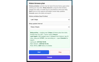 แผน API ของ Maton — การจับภาพการท่องเว็บเป็นส่วนเสริมของ Chrome ที่ออกแบบมาเพื่อปรับปรุงประสบการณ์การท่องเว็บของคุณโดยการสร้างไฟล์ JSON `matonPlan` ขนาดกะทัดรัดตามกิจกรรมของคุณ เครื่องมือนี้ใช้ประโยชน์จากประวัติการท่องเว็บล่าสุดและการเยี่ยมชมแบบสด โดยการจัดกลุ่มเว็บไซต์ที่คุณใช้บ่อย มันให้วิธีการในการจัดแนวตัวแทน AI หรือการทำงานอัตโนมัติกับรูปแบบการใช้งานจริง เพื่อให้แน่ใจว่าการรวม OAuth ที่ถูกต้องถูกนำมาใช้ ผู้ใช้สามารถตรวจสอบข้อมูลที่สร้างขึ้น ยกเว้นแหล่งที่มาที่ละเอียดอ่อน และดาวน์โหลดไฟล์ JSON หรือใช้รีเลย์ในท้องถิ่นสำหรับการประมวลผลต่อไป